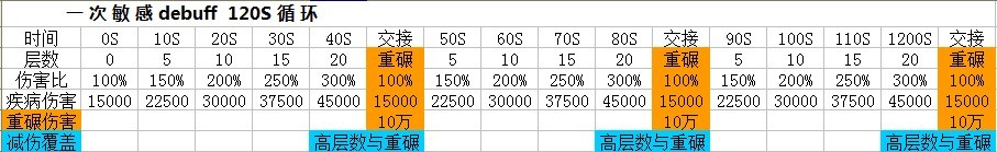 在2min内敏感2S一层共可叠加60层,以40S为一个分段叠20层以后全团的aoe伤害已经达到了4.5万每跳,而交换疾病所带来的重碾为物理伤害,实际只会造成10万左右的伤害所以还是比较合理的,但我们需要注意把减伤技能覆盖好重碾极其前面几S的高伤害.
