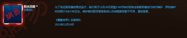 《魔兽世界》国服官方运营团队发布了最新的维护公告,本次维护将从11月20日凌晨5点开始,预计持续8小时左右: