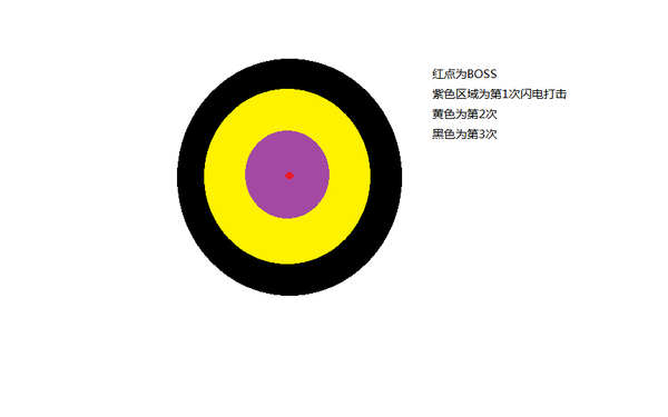 这个阶段打电王,水王死后,电王会获得1层强化,得到1个新技能闪电风暴,此技能会以自己为中心施放闪电打击,第1次施放在自己脚下,后面会放在20,40.60和80码的圆环上,圆环宽度20码,如下图所示