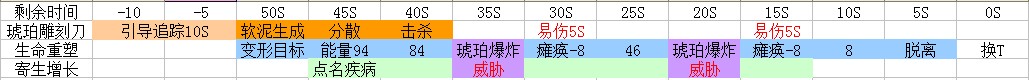 5,P1技能组合分析:(表)P1三个核心技能 琥珀雕刻刀,生命重塑和 寄生增长CD都为50S,实际上它们之间是一个组合技能,掌握它们的时间结构就能更好理解塑形者战斗的核心机制.从表内我们可以很容易看出:
