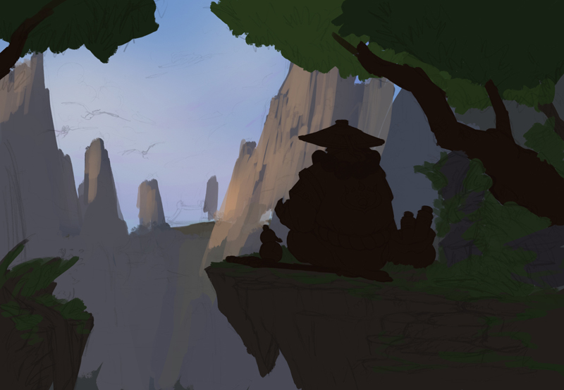 这幅图取名《静》主要是想到熊猫人就想到中国风中有一点禅意的部分,所以想画一幅静谥一点的画作。