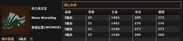 魔兽世界5.1来临后,不知道朋友们获取第一块战斗之石后会用到那个绿宠身上?相信很多朋友会说渡鸦,会说灵猫魔宠,不过我是会将绿色的法力龙宝宝提升成蓝色品质哦。它的技能绝对实用,相信很多朋友见到过带幽光雏龙的,没错法力龙宝宝和幽光雏龙技能一样。唯一不同的是,在目前版本中幽光雏龙是蓝色品质宠物,而法力龙宝宝是绿色品质宠物,这就意味着法力龙宝宝将有很大的提升空间。一旦开了5.1后,法力龙宝宝经过品质提升,属性绝对要比幽光雏龙好哦!不信请看下图: