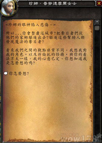 具体的是康奈利在间谍活动的时候注意到夺日者为部落服务,所以联盟派出小王子去劝说吉安娜驱逐(肯瑞托的)血精灵,并让联盟英雄去协助。