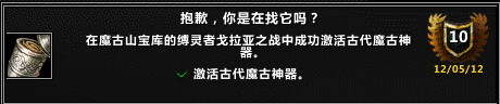 此成就中的古代魔古神器在内场的正中间,鼠标指向后会变成齿轮,进去激活两次就跳成就。