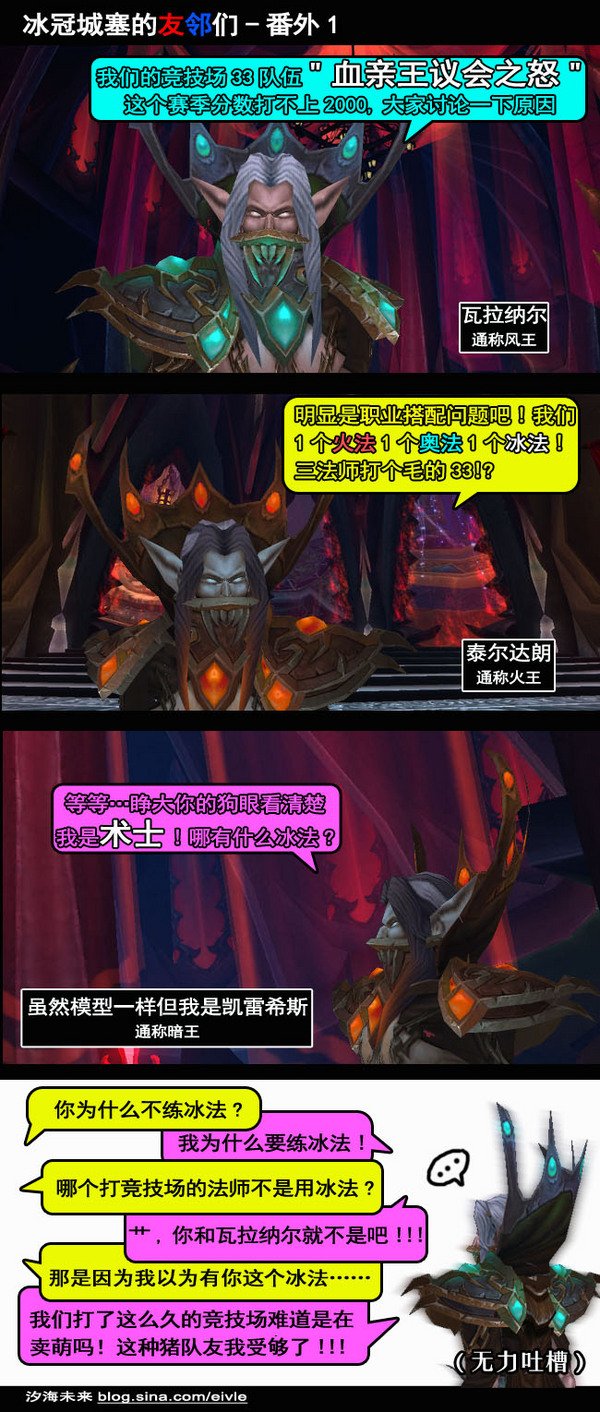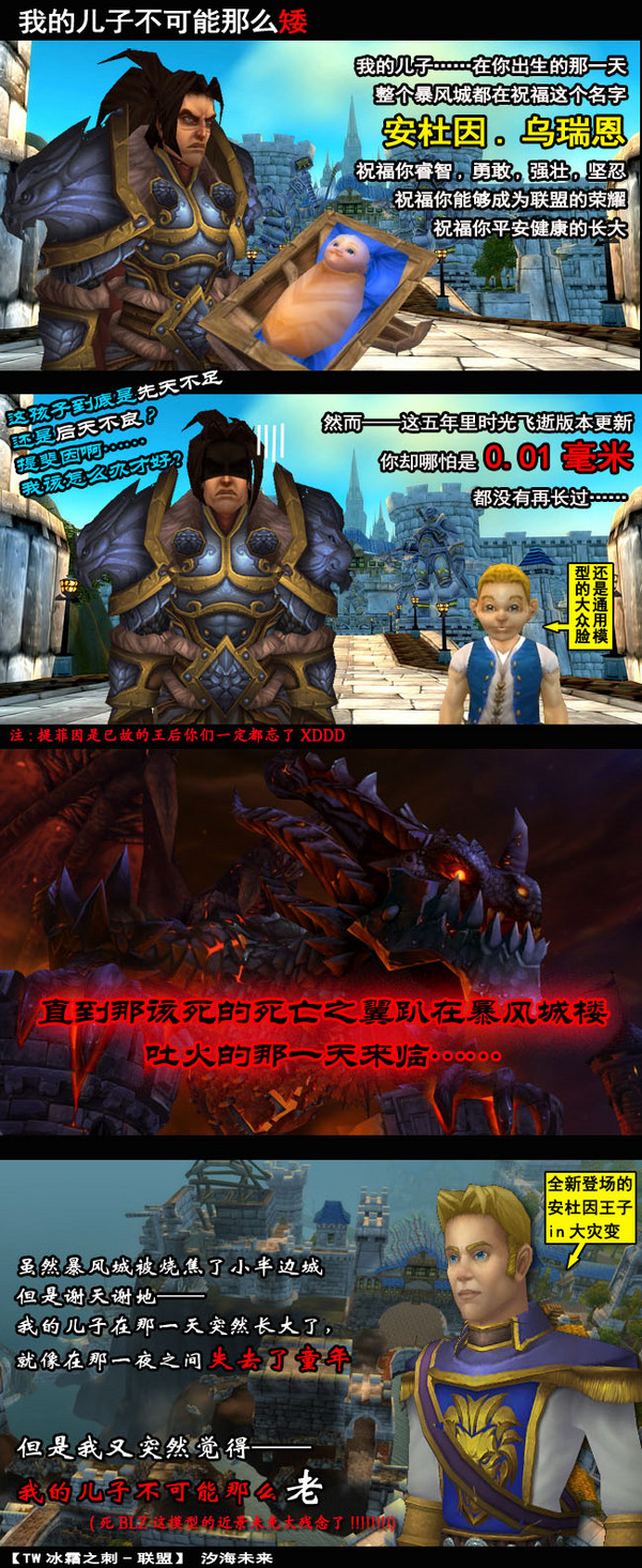 台服大灾变上线后安度因王子跟我想象中的形象出入太大于是做的吐槽漫,都是按照台服的译名LOGO还留着台服的服务器名=,=原本后续还有——我的儿子不可能那么弱、我的儿子不可能那么神棍、我的儿子不可能是牧师等等等等不过除了标题之外我完全不记得当时构想的情节了……