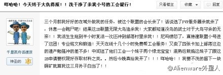 三个月前我好好的在域外做我的任务,被这个联盟的会长杀了!话说选了PVP服务器杀就杀了,休息一会跑尸吧!结果这2B联盟无限大鸟追杀我!大家都知道没鸟的战士对于大鸟守杀的无奈!!我活生生拖到半小时复活一次还冲到部落村里杀我!!尼玛愤怒了,直接建联盟小号进了这团!专业铭文和锻造!天天在线十几个小时免费帮工会服务!又卖了四张卡加上部落这边的遗产勉强冲的差不多!中间送了他们工会一个妹子两个绿龙宝宝!混熟后鼓捣这妹子了跟这2B申请要权限好存取材料之类……然后今晚真给我开了!!!咩哈哈!!我要不洗的留下一块铜矿就算我这三月孙子白当了!!