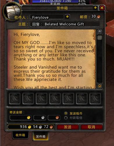 我当时一看到这个邮件..我都说不出话了来了.包括我表弟,我朋友.可能我的文采不好,写不出让人感动的感觉..但是真的被感动到泪流满面立马上来发帖子了好吗!在鲜血,我的公会,我是官员.我觉得我以后也要这样对待新人.要让他们感动,要给他们家的感觉,喜欢待在这个公会.有个好的印象.