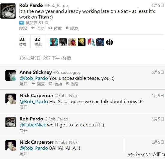 暴雪副总 Rob Pardo 在最近的微博里说他新年之后周末加班加点在做泰坦,后面跟帖的暴雪执行美术总监 Nick Carpenter 开玩笑说现在我们可以公开谈这个了,Pardo 笑答:让我来慢慢揭晓吧 ;)