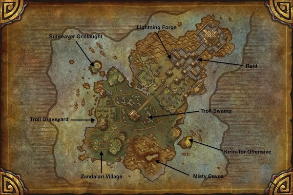 副本群坐落东北,大门中轴线穿过中央神庙,把地图一分为二2边分别偏近联盟和部落营地,这条中轴线也是第一期雷神岛视频的主要取景处.