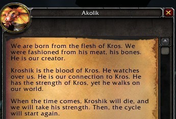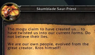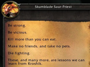 根据污刃祭司所言:污刃蜥蜴人诞生于暴龙克洛斯的血肉,而克洛斯的子嗣则成为了污刃氏族的创造主,保护者,以及氏族的崇拜对象