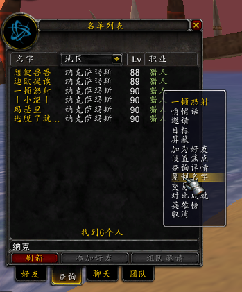 第二步:按一下回车把聊天输入栏激活,然后从第一个名字开始,挨个点击右键菜单,选择“复制名字”, 在聊天输入栏就会得到准确名字。此时不要急着将名字粘贴到外面,我们敲入一个空格后继续操作下一个名字。 重复直到所有名字都已记录,最后组成一个名字串,把名字串复制粘贴到文档中备用。由于输入栏有长度限制, 名字太多的可能要分两到三次粘贴出去。 (如果右键菜单中没有复制名字的选项,请安装这个单体插件:FriendsMenuXP,一般只要装了大脚等集成插件的都带这个功能。)