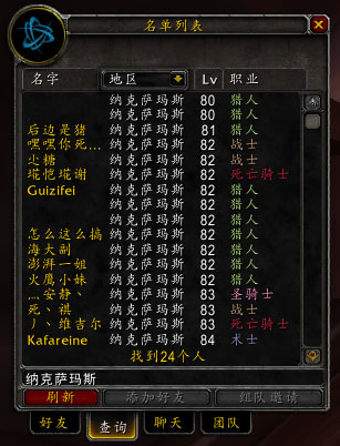我们可以发现,查询到的都是80至90级角色,猎人居多(猎人效率最高),推测其运行方式是将等级高的和等级低的号组队杀怪, 在刷G的同时等级低的号顺便吃经验升级,长大以后成为杀怪主力。为最大程度减轻误伤,请大家减少到纳克萨玛斯的活动, 以提高举报准确率,减少GM的工作量。同时,大家在举报时可以对90级玩家进行简单问话以排除正常玩家, 比如:在不在、请问纳克萨玛斯有什么好玩的呀。