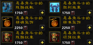 点数需求:双手武器3500,单手2250,副手/盾牌1250,头/胸/腿2250,肩/手/腰带/鞋/饰品1750,护腕/戒指/披风1250,项链2250。