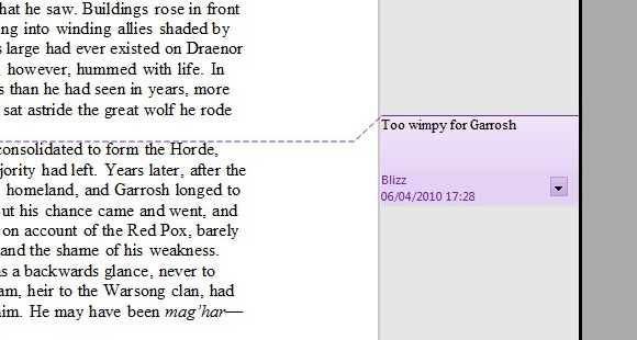 说到角色,我们有权选择的是可以自己创建一个次要人物或者整合现有的以某种方式来填补所需的角色。我本人喜欢用那些剧情里原本就出现过的人或者游戏里的NPC,原因我在前面说过了,独特的名字其实是很少的,而且我还觉得读者喜欢那些他们熟悉的人物在新的小说里变得丰满。比如在小说《战斗之心》中出现的克雷娜和高戈娜(参见部落灰熊丘陵竞技场系列任务,译者注)就是我在深思熟虑之后选定的。当时的情况下,任何兽人和加尔鲁什说那些话都可以,但是使用一个玩家熟悉的角色可以让我加入一个用以交互的平台,否则就难以实现这样的效果。我喜欢那些在写作中几乎被遗忘不用的一些小技巧,所以我努力尝试把它们加入到我的创作中。