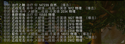图中第一个裂伤2000伤害,第二个裂伤暴击了15000伤害,减半后相当于未暴击裂伤7500左右,被拆卸时裂伤伤害为平时的26%;第一裂伤前后分别打了2次平砍,还都暴击了,平均伤害1700,未拆卸时也发生了一次平砍暴击5372,对比发现拆卸时伤害为平时的31%。正常情况下面板伤害从1.1-1.4万浮动,上述26%,31%的比例都在30%上下浮动,所以能够证实拆卸影响裂伤、撕碎、毁灭与平砍造成影响,使这些直接性伤害技能伤害降低至30%左右。