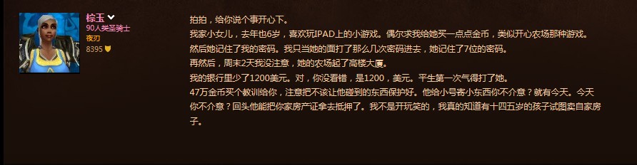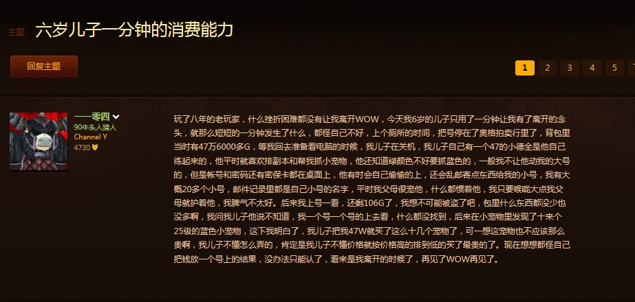 “玩了八年的老玩家,什么挫折困难都没有让我离开WOW,今天我6岁的儿子只用了一分钟让我有了离开的念头,就那么短短的一分钟发生了什么,都怪自己不好,上个厕所的时间,把号停在了奥格拍卖行里了,背包里当时有47万6000多G,等我回去准备看电脑的时候,我儿子在关机,我儿子自己有一个47的小德全是他自己练起来的,他平时就喜欢排副本和帮我抓小宠物,他还知道绿颜色不好要抓蓝色的,一般我不让他动我的大号的,但是帐号和密码还有密保卡都在桌面上,他有时会自己偷偷的上,还会乱邮寄点东西给我的小号,我有大概20多个小号,邮件记录里都是自己小号的名字,平时我父母很宠他,什么都惯着他,我只要喉咙大点我父母就护着他,我脾气不太好。后来我上号一看,还剩106G了,我想不可能被盗了吧,包里什么东西都没少也没多啊,我问我儿子他说不知道,我一个号一个号的上去看,什么都没找到,后来在小宠物里发现了十来个25级的蓝色小宠物,这下我明白了,我儿子把我47W就买了这么十几个宠物了,可一想这宠物也不应该那么贵啊,我儿子不懂怎么弄的,肯定是我儿子不懂价格就按价格高的排到低的买了最贵的了。现在想想都怪自己把钱放一个号上的结果,没办法只能认了,看来是我离开的时候了,再见了WOW再见了。”