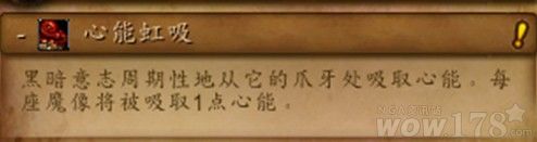 心能虹吸:黑暗意志周期性地从它的爪牙处吸取心能。每座魔像将被吸取1点心能。 意志之触:黑暗意志周期性地随机腐蚀一名目标,在接下来的战斗中每4秒造成 [30000] 点火焰伤害。 心能之泉:在心能达到50点时,黑暗意志可以进一步腐蚀受意志之触影响的目标,使其每1秒向周围发射心能之箭。被心能之箭击中的敌人将受到 [237500~262500] 点火焰伤害。 震荡干涉:在心能达到75点时,黑暗意志将施放一股爆裂能量,造成341250~358750点自然伤害并打断所有玩家的施法。 全力之击:在心能达到100点时,黑暗意志将发射一波心能箭雨随机打击目标。每支心能之箭可对冲击点周围5码范围内的敌人造成 [332500~367500] 点火焰伤害。 |
