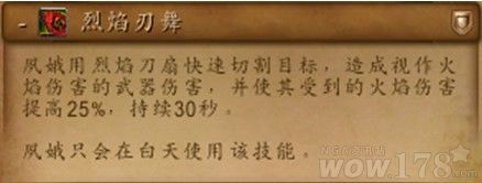 烈焰刃舞:夙娥用烈焰刀扇快速切割目标,造成视作火焰伤害的武器伤害,并使其受到的火焰伤害提高25%,持续30秒。夙娥只会在白天使用该技能。