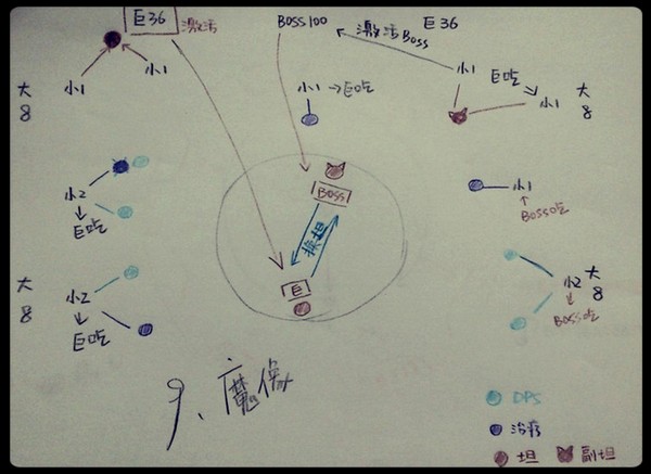 站位,将场地分为4块,分别站[3+3+2+2人]或者[2+2+2+2人2个治疗站左右两个半场支援],这个请根据分担压力来选择。左右半场各分一个坦,方便拉遗漏没接到的小怪。