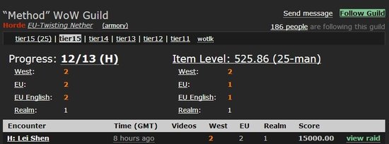 北京时间27日早8时,欧服著名公会Method击杀了25人英雄模式雷电王座的最终boss雷神,他们是继Dream Paragon之后世界第二个击杀雷神的公会,同时也是世界首个通关25人英雄模式的团队。而备受关注的国服首杀目前还尚未出现,截止27日下午,国服进度领先的两个公会“七煌”和“星辰”距离首杀都还差最后2个boss,我们拭目以待。