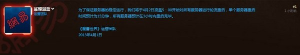 《魔兽世界》国服官方运营团队发布了最新的维护公告,本次维护将从4月2日凌晨5点开始对有所服务器进行轮流重启。。