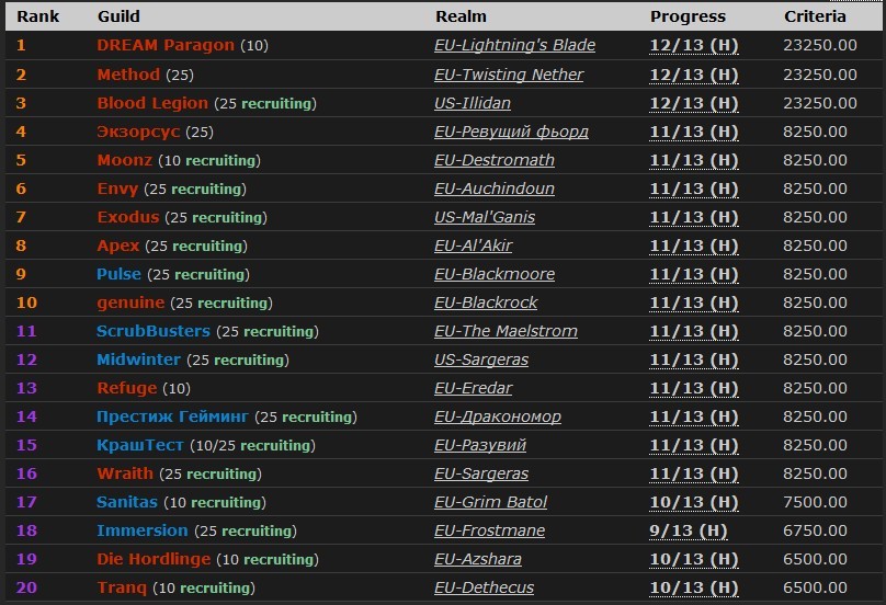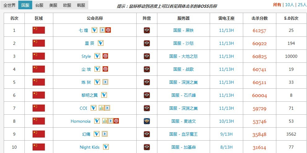 根据发稿时的wowprogress和捞月狗数据,可以看出,目前有13(欧美服)+4(亚服)+7(国服)=24家公会直面雷神。国服公会能否在这批大军中突围,成为下一个击杀H雷神的公会呢?