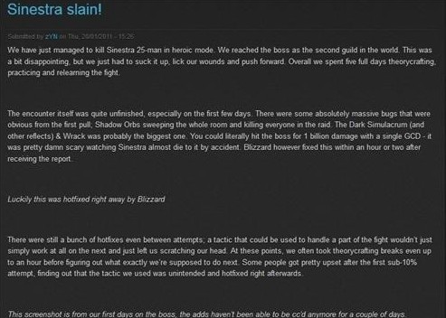 战斗本身未完成的程度相当大,尤其在前几天。第一次开BOSS的时候有好几个超级大BUG,暗影 宝珠横扫房间,把全团人马拍翻在地。死亡骑士的黑暗拟态能够复制毁灭debuff(编者注:龙母战斗中,毁灭debuff随机给几个玩家施放,造成越来越 高的暗影伤害,并且驱散后会分裂成2个)可能是最大问题。照这么做,你真能在一个GCD内实实在在地打掉BOSS十亿血——塞丝特拉差一点就这么给打倒 了,真是见鬼。暴雪接到这个报告之后,一两个小时内就把它修复了。