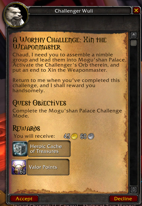 获得装备的途径真是越来越多了!上周我们介绍了英雄挑战模式下玩家将有几率获得516级的紫装,作为存在感同样不高的5人本挑战模式也同样将在5.3中迎来大的改动---你只要完成每天的挑战日常任务,便同样有几率从所奖励的英雄的财宝箱(Heroic