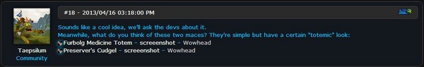 暴雪社区经理Taepsilum对此也表现出了极大的兴趣。他也认为这个点子确实很coooooooooooooooooool!并表示会询问一下开发人员,看看能不能让这个想法成真。同时Taepsilum还从数据库里挖出了两把长得有点儿像图腾的单手锤,不过怎么看怎么觉得不够带感呐!