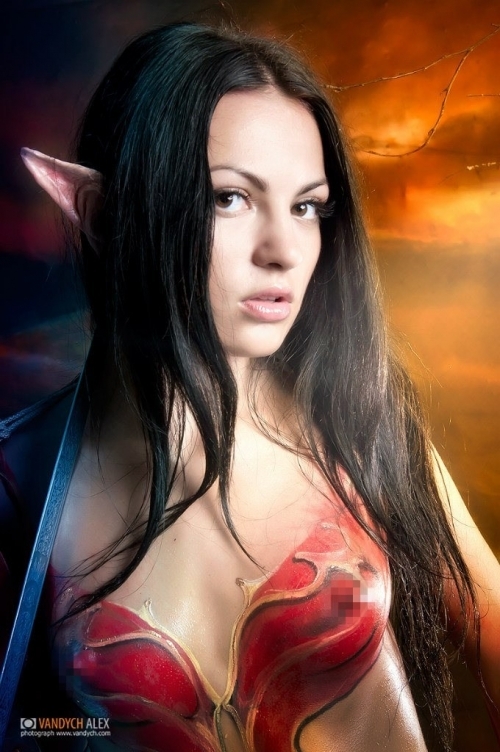 俄罗斯的VandychAlex是位典型的艺术家与玩家的结合体,其代表性COS摄影作品碉堡之处在于:1、御用Coser全是漂亮妹子;2、她们的衣服全是用油彩画在身体上的(彩绘这玩意一般是用手直接抹画)……没错,Vandych就是这么一个很有才的人体彩绘师兼人生赢家。而且他的作品涉猎范围很广,从魔兽世界到地狱男爵,从古典哥特到蒸汽朋克,无一不包。
