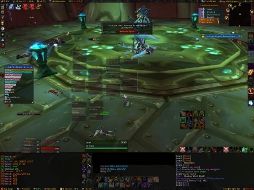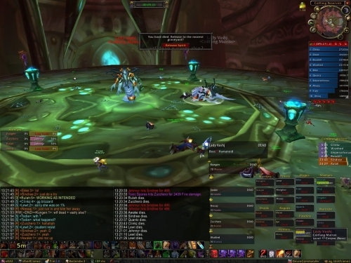 瓦斯琪是整个TBC戏份最多的BOSS之一,大概也是bug最多的boss之一。尽管整场战斗的随机性十分大,这还算是能打的,但是首杀来的十分蹊跷。按照Kungen的说法,他们打到一半的时候瓦斯琪突然bug了,开始拼命掉血然后挂了。接下来的事情更神奇:瓦斯琪立刻就重生了,而她“双胞胎姐姐”的尸体还躺在旁边的地板上,能拾取!后来一名前Nihilum成员Lewt在论坛发了个帖子,表明Nihilum是有意利用游戏漏洞击杀的,而他就是那个给瓦斯琪最后一击的人,并且他保留了截图为证(图1)。他表示瓦斯琪在重置的时候会bug,保持1%数秒钟,而此时他迅速的用灵魂石爬起来,丢出了那个致命的暗言术:死。大量Nihilum的成员随后表示这简直就是瞎扯。参与首杀的其中一名团员Starym表示,他们在瓦斯琪极低血量的时候灭团了,而Lewt灵魂石爬起来,在瓦斯琪恢复血量的过程中秒了她。在Lewt提供的截图后数秒保存的另一张截图(图2)证明Lewt完全是在自说自话,并且这个bug的发生并不是有意为之的。当然,说不定所有的聊天内容都是伪造的呢!