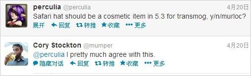 魔兽世界首席内容设计师Cory Stockton近日在推特中表示,宠物战斗成就奖励的狩猎帽或将在5.3补丁中开放幻化:
