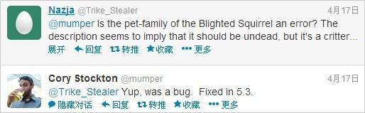 另外他还表示目前小宠物:生病的松鼠给归类成小动物是个BUG,应该归类到亡灵类中去。这个BUG将在5.3补丁中修复: