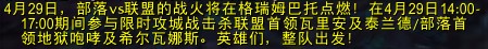 4月29日,部落vs联盟的战火将在格瑞姆巴托点燃!在4月29日14:00-17:00期间参与限时攻城战击杀联盟首领瓦里安及泰兰德/部落首领地狱咆哮及希尔瓦娜斯。英雄们,整队出发!