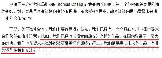 此外,丁磊也在网易的第一季度财报中提到未来会与暴雪在产品上有非常深的接触和交流,而在《倩女幽魂2》海外代理商的选择问题上,将优选考虑网易的合作伙伴。