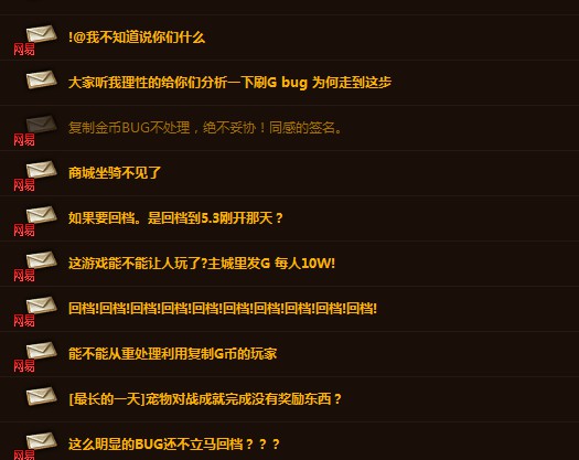 在5.3补丁更新后爆出无限刷金币的bug,似乎还是和手机拍卖行有关。目前该Bug已经被不少工作室知晓,在短短时间里成功复制出数以亿计的金币,已经对不少服务器的经济造成了巨大的影响。让大量玩家感到愤怒和抗议,在官网论坛上纷纷要求严惩,服务器回档或是赔偿。