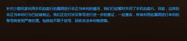 针对少数玩家利用手机拍卖行的漏洞进行非正当牟利的情况,我们已经暂时关闭了手机拍卖行。目前,这样的非正当牟利行为已经被制止。我们正在对涉及账号进行进一步的查证,一经查实,所有利用此漏洞进行牟利的账号将受到严肃处理。包括但不限于封号、回收非法牟利物资等。
