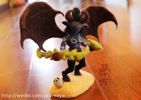 在我们的印象中,羊毛毡几乎是萌物的“带盐人”,而独立羊毛毡手作人小纯纯颠覆了这一惯性,为大家带来羊毛毡作品——恶魔猎手——伊利丹·怒风。向我们展示了恶魔猎手温存的一面,柔情中却也散发着钢筋铁骨般的意志。本作品身高15cm,全身骨架由铁丝搭建,因此可以摆放不同姿势,翅膀也能随意伸展闭合。眼睛与纹身分别镀上了夜光漆,在黑夜里能散发出光芒,整个作品向我们展示着生命与力量。