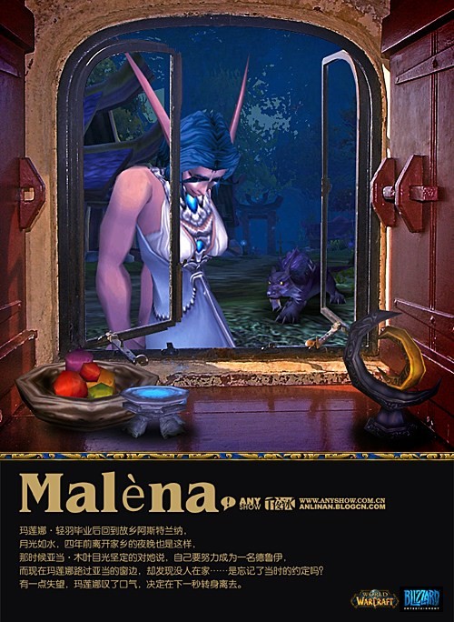 [10]玛莲娜·轻羽毕业后回到故乡阿斯特兰纳,月光如水,四年前离开家乡的夜晚也是这样,那时候亚当·木叶目光坚定的对她说,自己要努力成为一名德鲁伊,而现在玛莲娜路过亚当的窗边,却发现没人在家……是忘记了当时的约定吗?有一点失望,玛莲娜叹了口气,决定在下一秒转身离去。