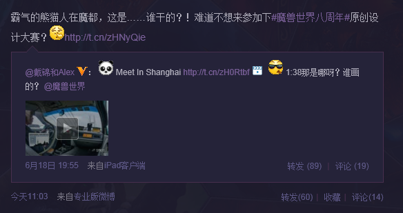 这件“熊猫人在魔都”的涂鸦作品,显然引起了官方的注意。昨天晚上和今天早上暴雪***区总经理和魔兽世界官方微博先后发布微博,寻找这片涂鸦墙的作者。魔兽官方微博主页君更幽默表示“难道不想来参加下#魔兽世界八周年#原创设计大赛?”