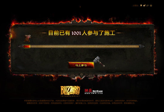 整个站点虽然只有一个页面,组成元素却颇具迷惑性。图中最显眼的莫过于“目前已有N人参与了施工”的文字和“马上参与”的按钮,而文字色调和按钮形状,都带有明显的《魔兽世界》风格。点击“马上参与”按钮以后,弹出了魔兽玩家耳熟能详的地精口头禅“时间就是金钱,我的朋友!”每次刷新页面,还能看到不同的魔兽NPC在标示着参与人数的进度条上跑动……它们难道是为魔兽5.4补丁日夜赶工?考虑到5.3刚上线一个多月,很多玩家还没跟上进度,装备声望任务都没饱和,应该不会这么快就开启新篇章。