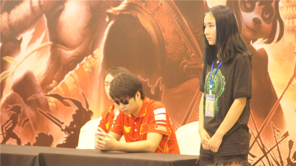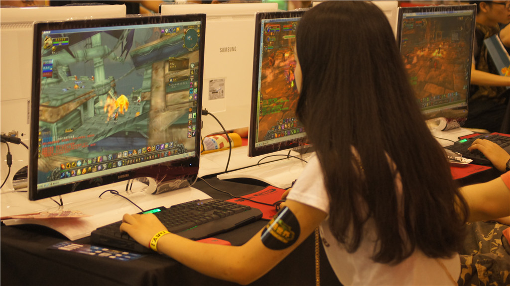 在现场,暴雪展台搭建了数台设备供玩家试玩游戏,很快这里就座无虚席。当然,也不乏许多热爱魔兽的女玩家!可以到这位漂亮的萨满妹子正在打远古海滩,她甚至还在手臂上贴了《魔兽世界》的LOGO来表达自己对魔兽的热爱。
