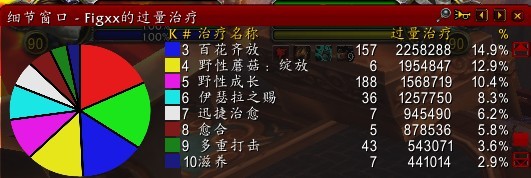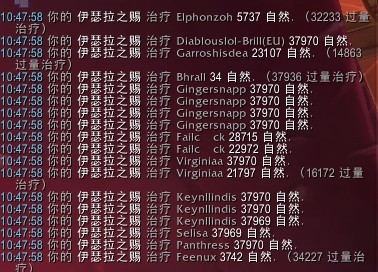 图中顺劈斩为特效名称,我只用回春+起源来做实验的,可以看出,当回春爆击触发了特效之后,对周围目标的治疗也是爆击效果。