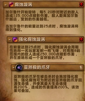 boss定期释放一个类似旋转动画的技能,离boss越远伤害越低。当boss的能量到达25后,该技能会被强化,除了之前的效果以外,他还会对场上大多数玩家释放强化腐蚀漩涡,视觉效果就是黑色漩涡,2秒左右落地对8码内的玩家造成25w暗影伤害,不管有没有人被砸到都会产生一个亚煞极的爪牙,这种小怪是正常的仇恨机制,但是他们死的时候会给周围的亚煞极爪牙回满血量并赋予其一个buff,使他们的最大生命值提高200%,伤害提高 200%,可以叠加。