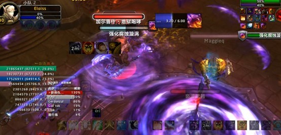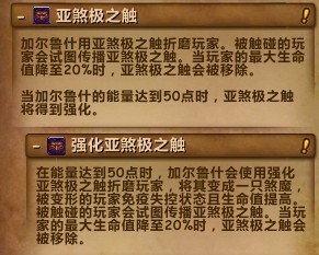 地狱咆哮周期性的控制玩家,这些玩家被控制之后会释放亚煞极之触,需要打断或者晕住,一旦他们释放出这个技能就等于传染了另外一个人也被控制,当这些被控制的人生命值降低到20%的时候,控制会被移除。Boss能量到达50的时候,地狱咆哮会强化亚煞极之触,这个时候被控制的人会免疫晕眩等失控状态的技能并且生命值提高,所以我们要做的就是第一时间沉默他们,而不是晕住他们,在打断和沉默的时候将他们的血量降低到20%即可,只要第一时间打断,这个技能的难度并不算高。