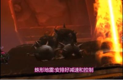 蛛型地雷:会锁定一个人,朝他那里移动,碰到他就会自爆,自爆会造成全团的伤害,所以不能开免伤去排雷。必须要把地雷打掉。需要安排好控制链,他被定身时只要接触到身边的人,无论是否是他的锁定目标都会自爆,所以注意他被定身的时候不要近身。