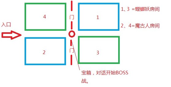 如示意图,我们进入走廊后看不到BOSS,但是走廊上有一个宝箱,四周有4个房间,对话宝箱(踢它……)开始战斗,一开始只能进入1、2号房间 (团队分为2组),里面有各种箱子(大、中、小)对别对应(14、3、1)点能量。我要做到就是在规定的时间内(270秒)每个房间均获得50点能量,然后进入下一个房间(1可以通4,2可以通3,中间有门,有开关,能量满50点就可以开门了)然后继续在规定的时间(重置270秒时间)内再次获得50点能量,然后继续开门,BOSS战斗就结束了。