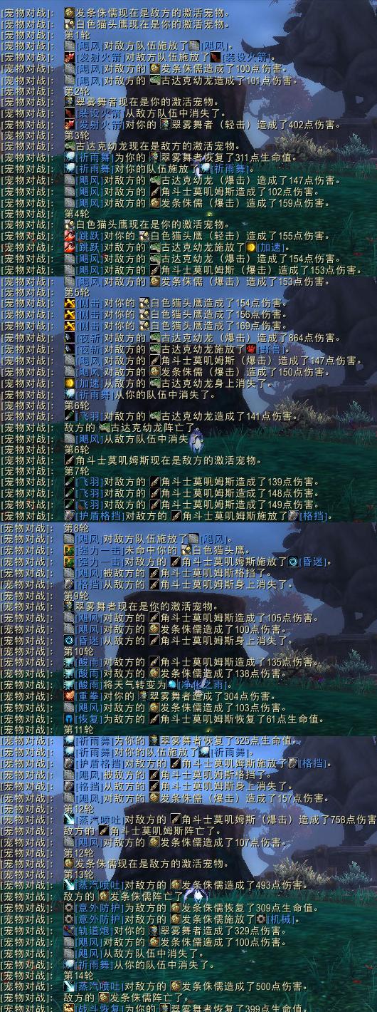 在属性上,翠雾舞者的元素属性可以克制机械,元素攻击可以克制同类元素,但比较害怕水系宠物。而作为拥有飞行系攻击的猫头鹰可以克制水系宠物,协防元素。猫头鹰作为全飞行攻击的宠物遇到龙类宠物比较吃亏,所以要依靠痛苦雏龙的亡灵属性以及召唤黑夜和酸性吐息双人形技能来补充。除此之外痛苦雏龙的龙类攻击对于既克制水系攻击又克制飞行宠物的魔法宠物威胁巨大,可以相互协防。而猫头鹰作为飞行宠物又可以克制痛苦雏龙双人形技能比较头痛的野兽宠物。
