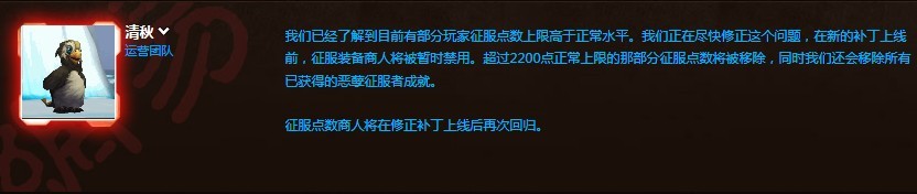 《魔兽世界》5.4补丁上线之后,国服和美服都出现了部分征服点数上线超过2200点的BUG账号。对于这一情况,国服运营团队发布蓝帖公告,接下来将采取措施修复这一BUG。在此期间,征服商人将暂时被禁用,而玩家超过2200点正常上限的额外征服点数也将被移除。