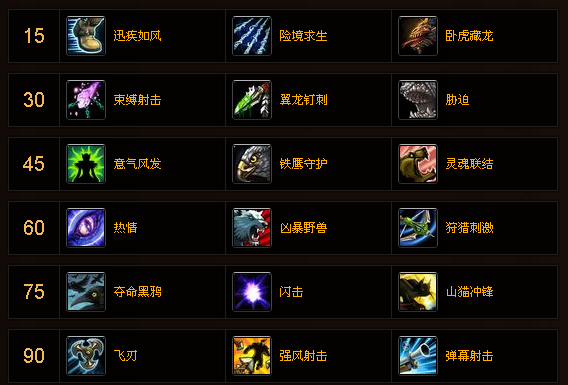 | 狩猎刺激 | 射击专精的另外一个流派"奥射精通流"所选用的天赋,但是在simc上通过调整HT16属性为暴击精通急速优先级模拟之后的最终秒伤还是要低于默认的"急速瞄准流"。 |